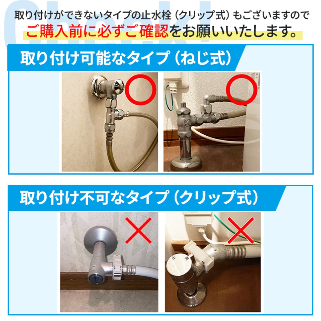 ●本製品を取り付けた後は試運転を行い、水漏れが無いかを確認してください。