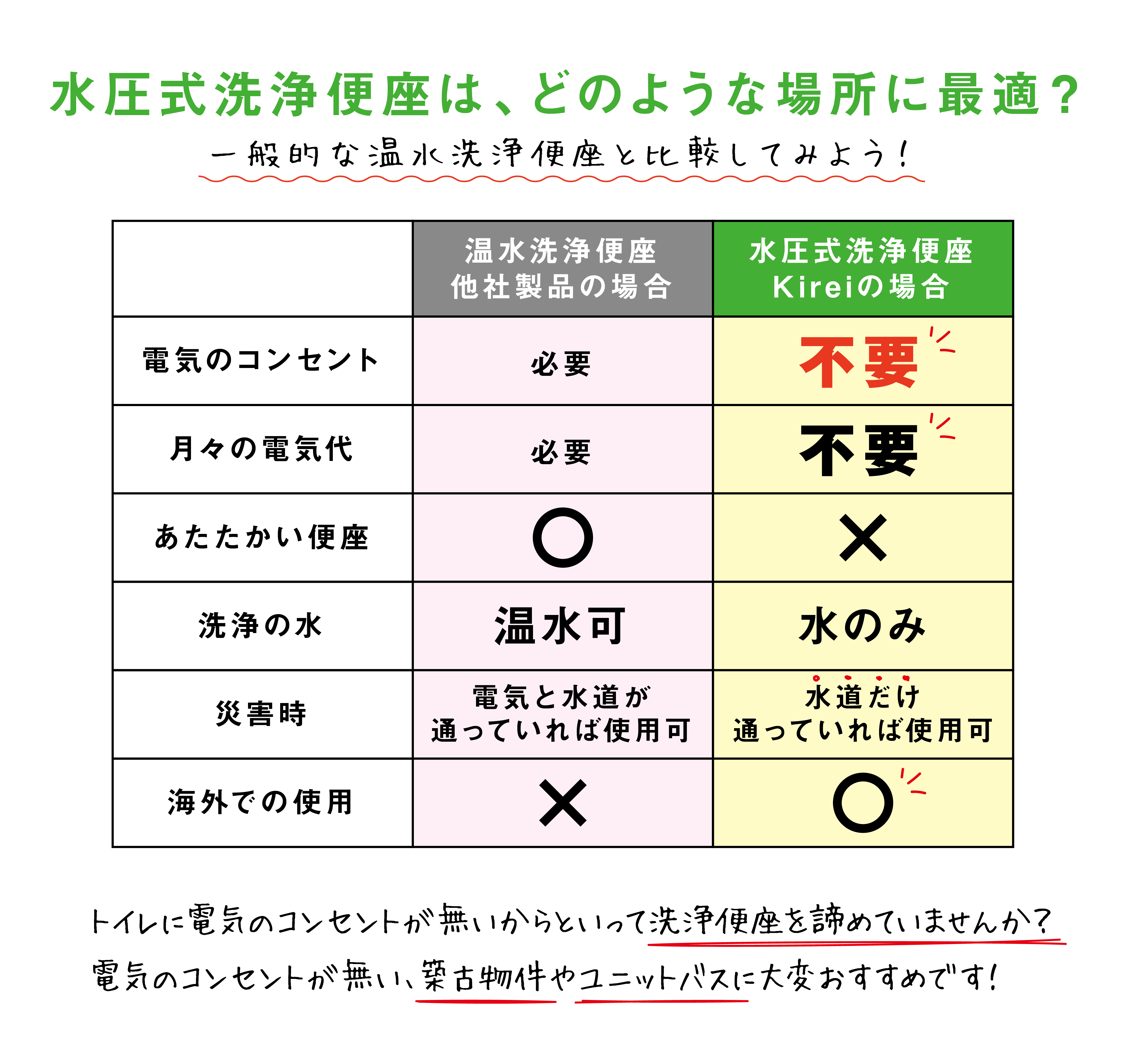 これまでトイレ環境に電源がないなどの理由で、温水洗浄便座(いわゆるウォシュレット)を取付を諦めていた方も多いのではないでしょうか?
